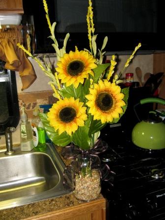 From the restaurant, we headed to ... HOBBY LOBBY! I do *love* that place. We were both interested in some stems. I wanted to do a floral arrangement for the 4th and I'd been wanting some sunflowers for an August/September arrangement. Joc helped me pick out my offerings, and these are what I came home and put together: